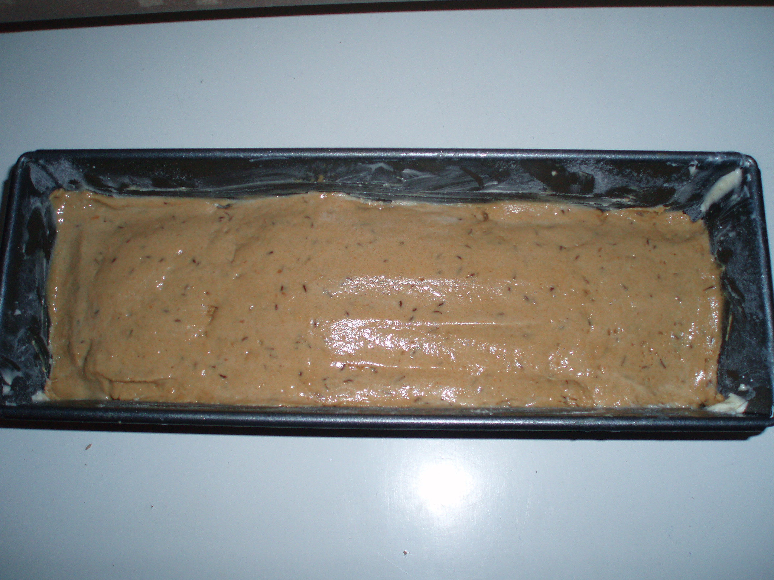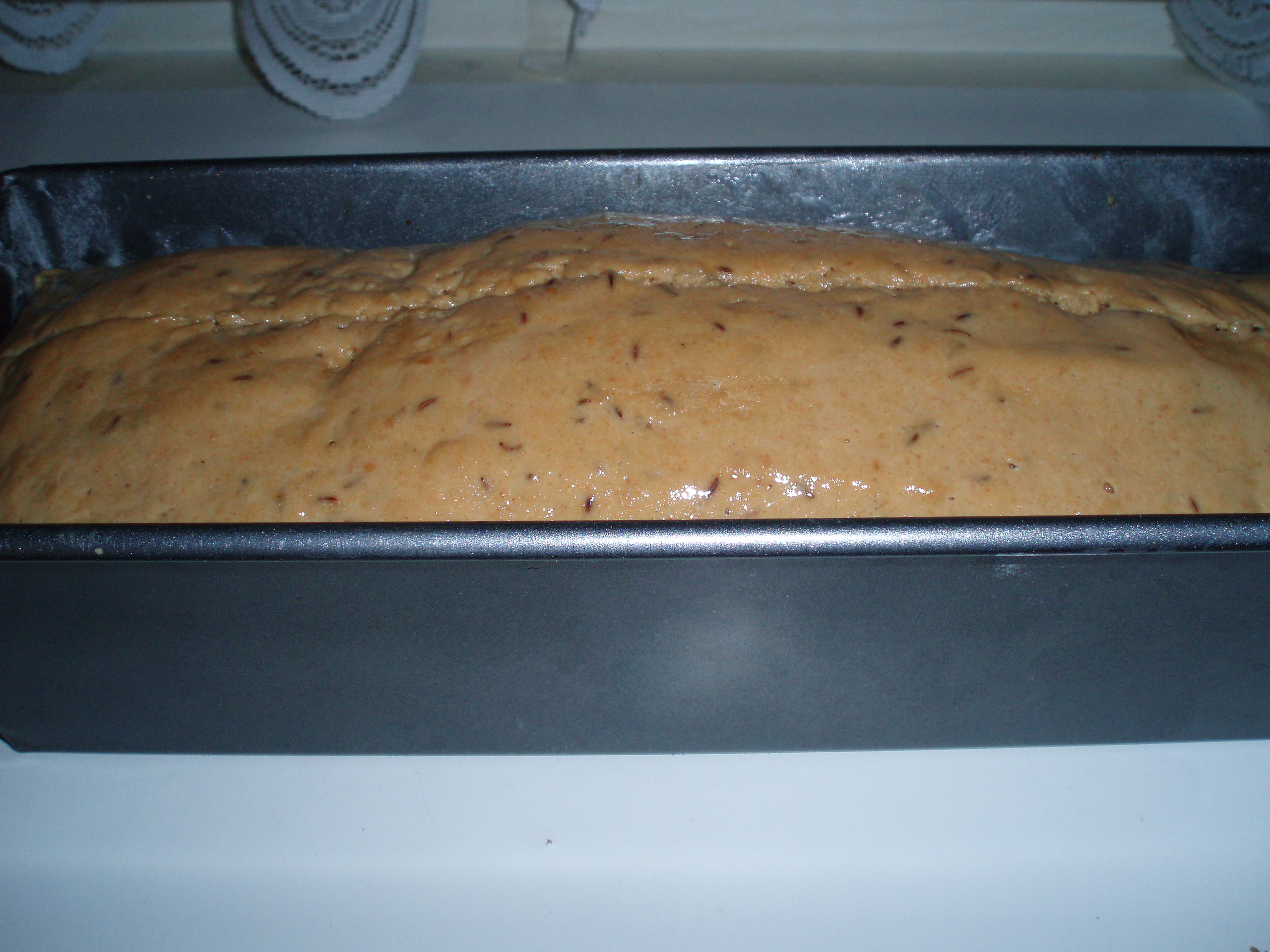 6. Kad mīkla pacēlusies, ar slapjām rokām maigi ievieto to formā, nogludinot virsmu. Jāpagaida vēl kādas 30min, kad mīkla paceļas vēl mazliet.