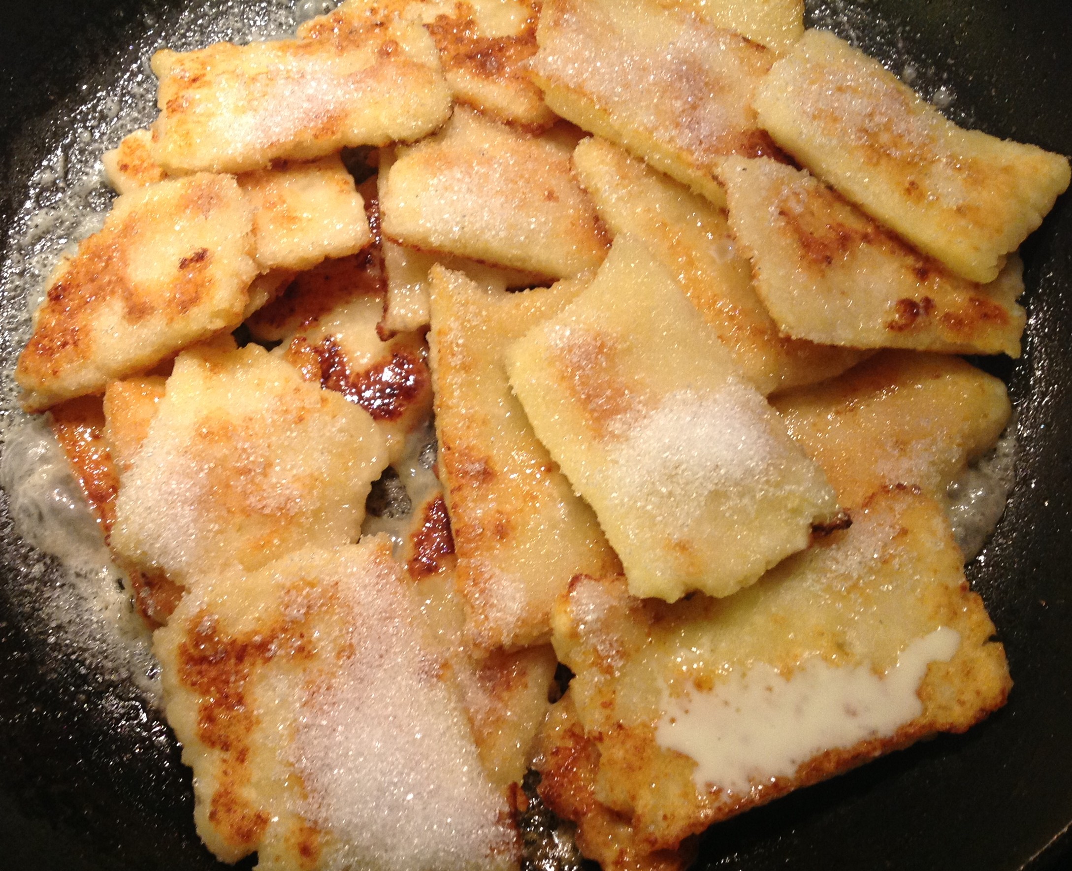 4. Kad visas pankūkas izceptas, saliek visas izceptās pankūkas pannā tādā kā kaudzē, pārkaisa ar cukuru un uzlej saldo krējumu. Pannā viegli apmaisa, kamēr visas pankūkas kļūst mīkstas, saldi lipīgas un spīdīgas.