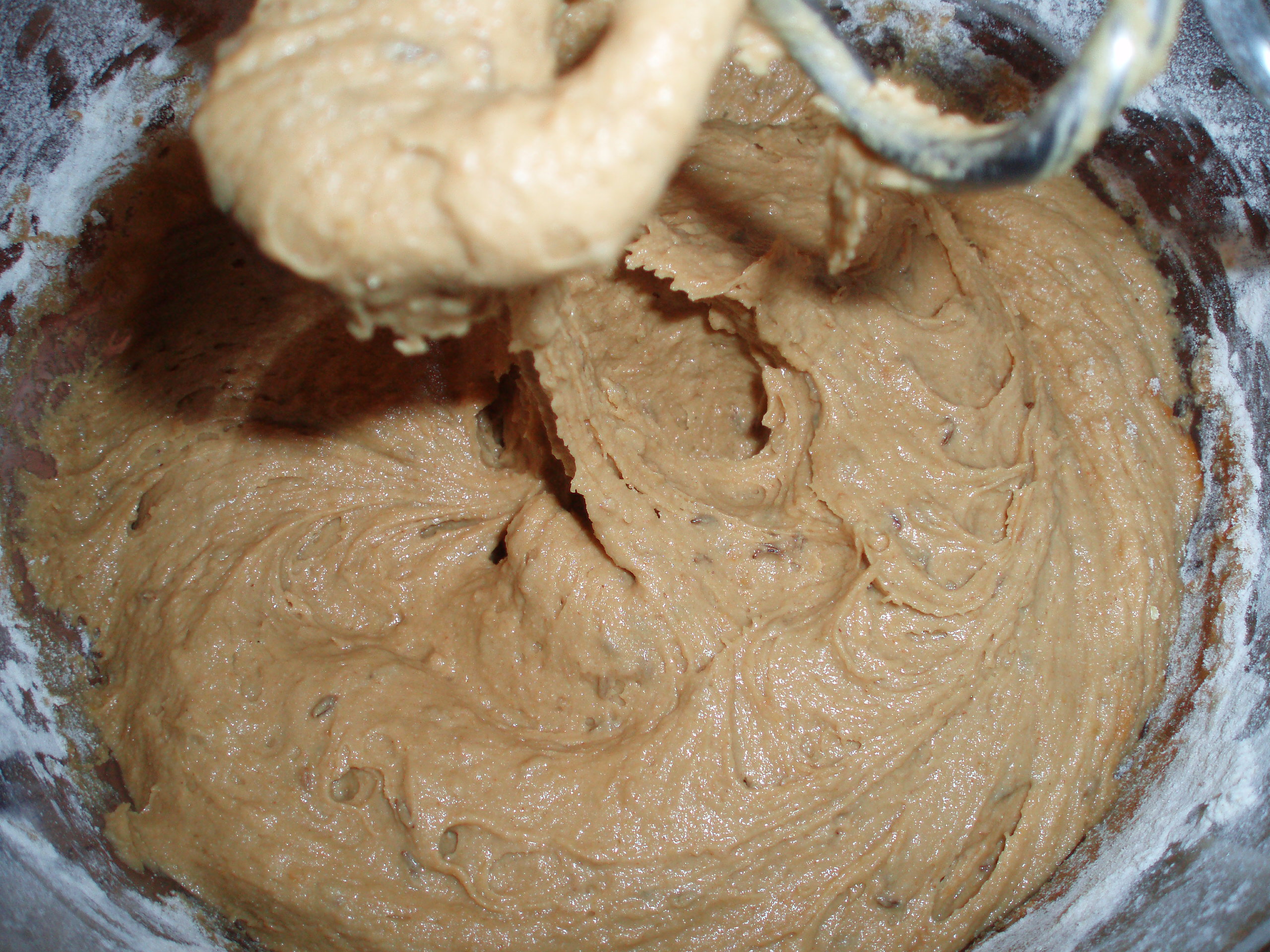 4. Pamazām pievieno sausās sastāvdaļas, ar mikseri lēnām kuļot masu. Rezultātā ir diezgan bieza masa.