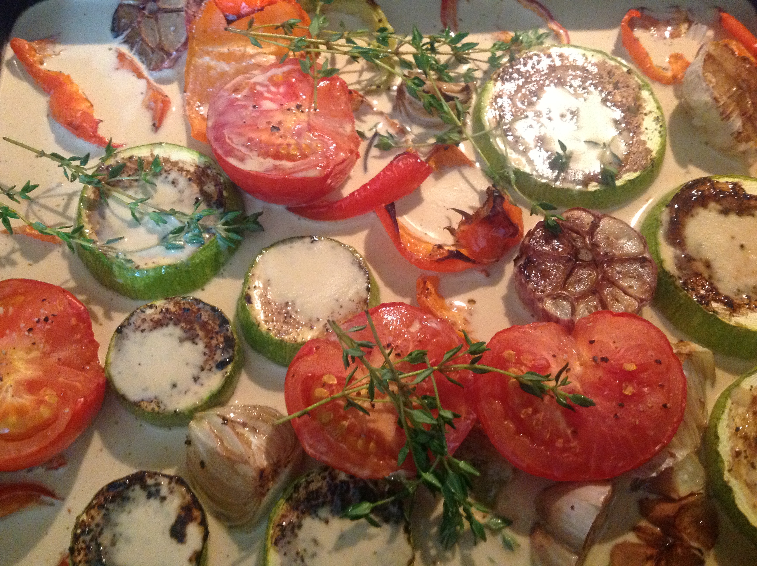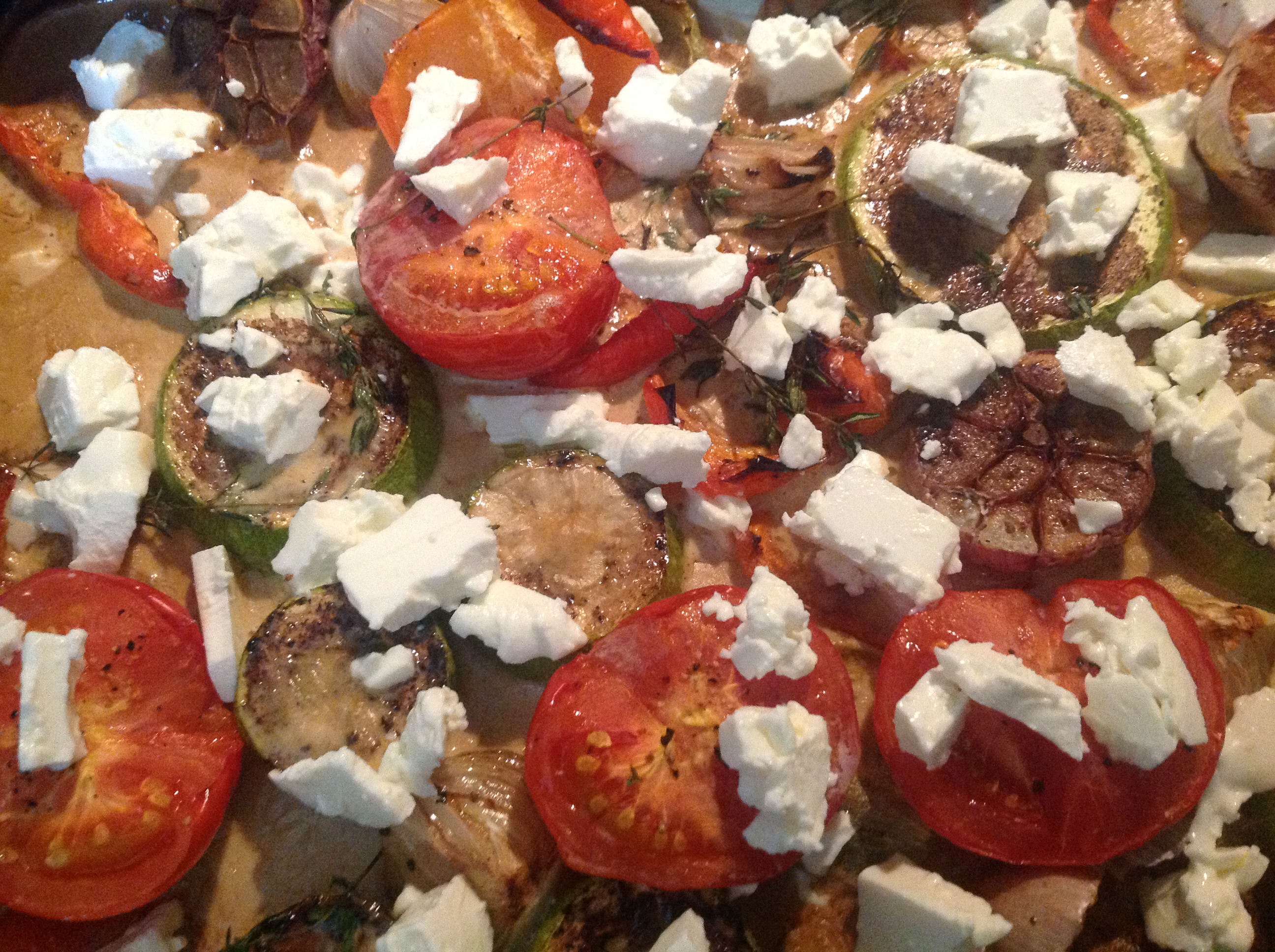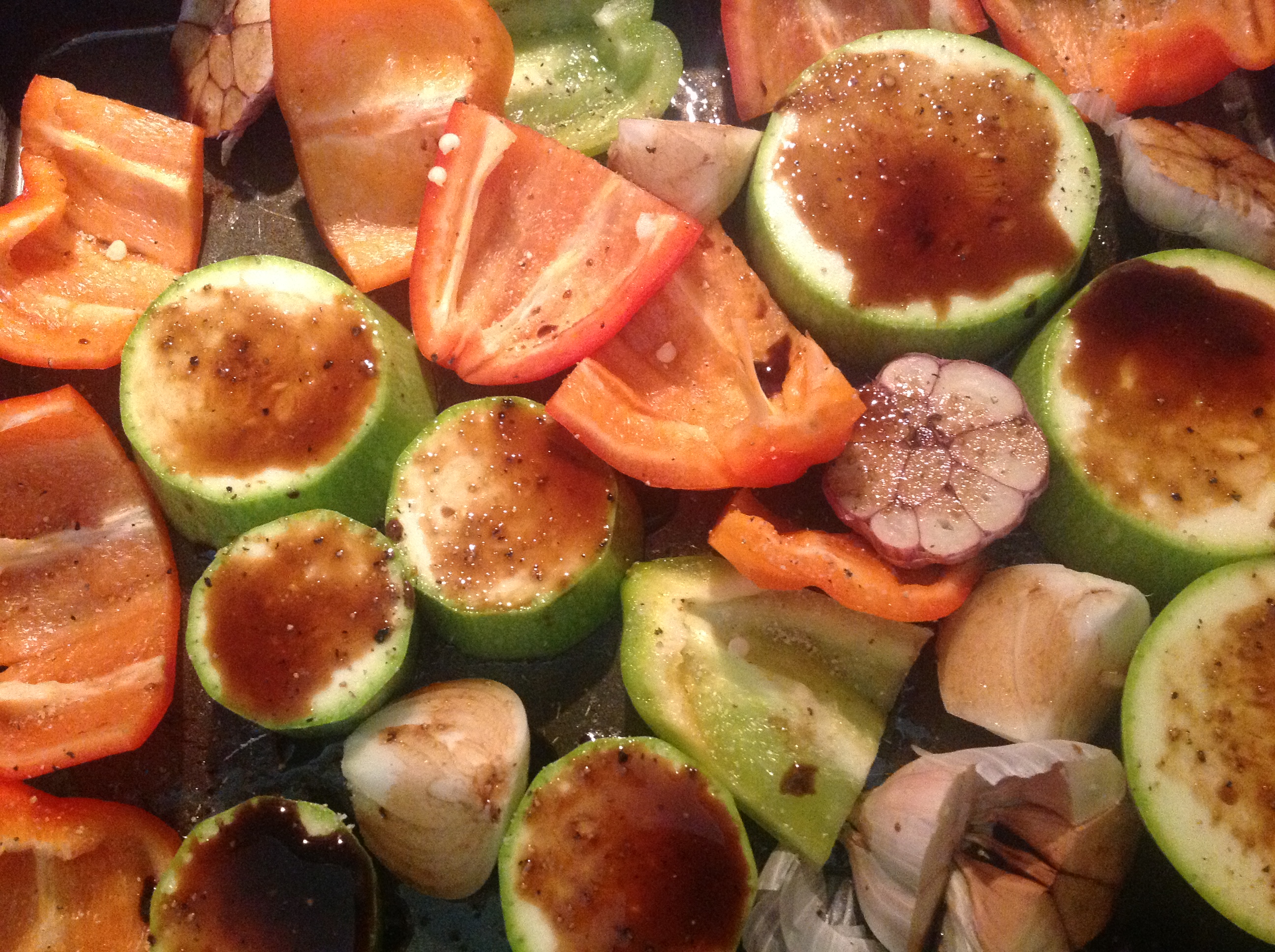 1. Ieslēdz cepeškrāsni uz 200C. Paplāti iesmērē ar eļļu. Lielos gabalos sagriež dārzeņus un izkārto uz paplātes. Cukīni apmēram 2 cm biezās apaļās šķēlēs, papriku 4 daļās, tomātu uz pusēm. Sīpolu sagriež 4 daivās. Ķiploka galviņu sagriež uz pusēm. Visu sakārto pamīšus uz cepamplāts ar augstām maliņām.