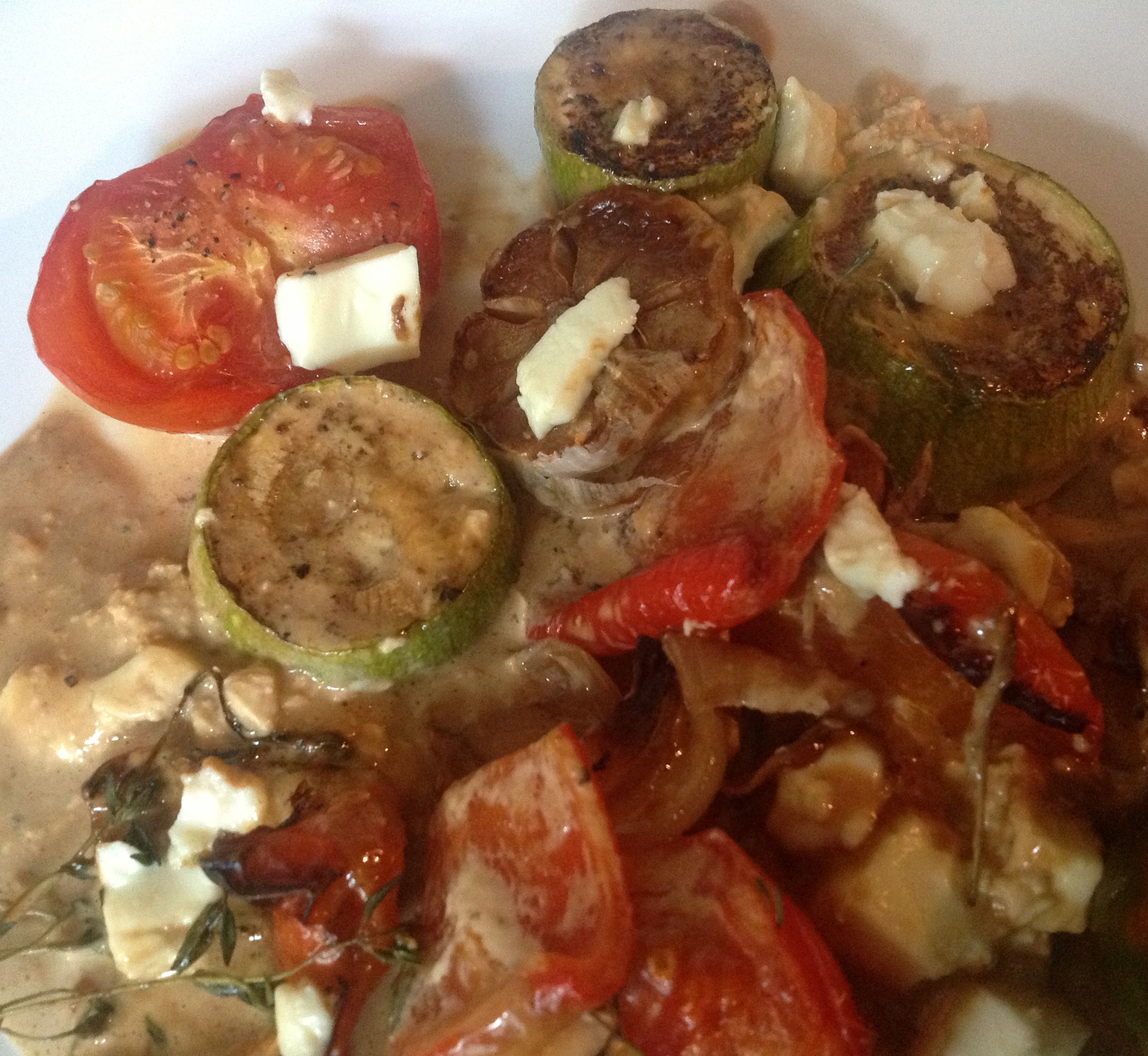 4. Kad dārzeņi, sīpols un ķiploks mīksti – apmēram pēc 40min uzlej saldo krējumu+sojas mērci un liek atpakaļ cepties uz 5min.