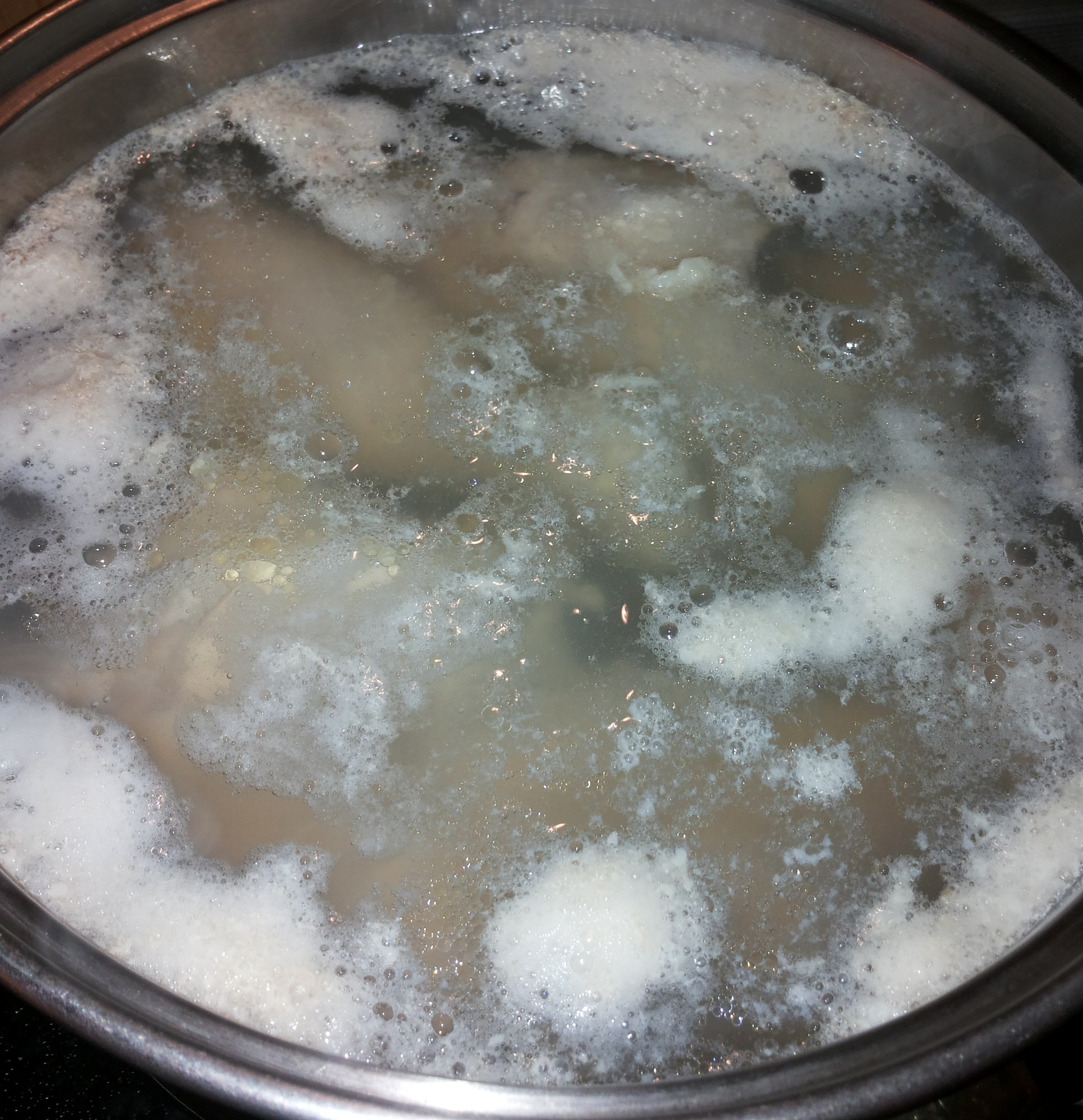 1. Sākam ar buljona vārīšanu. Vispirms augstā ūdenī nomazgā vistu un liek katlu ar gaļu un aukstu ūdeni uz uguns. Kad ūdens uzkarsis, parādās pirmie burbuļi un pelēkas putas. Es šai brīdī noleju visu ūdeni ar netīrumiem un vēlreiz nomazgāju vistas gaļu un arī katlu. Tikai jāuzmanās nevārīt ilgi pirms noliešanas, jānoķer brīdis ar pirmajiem burbuļiem, jo vistas gaļa izvārās ātri, tad viss labums tiks izliets izlietnē. Ir iespējams arī ar karoti ķeksēt putas nost, tomēr man šķiet, ka neizdodas tik tīrs buljons.