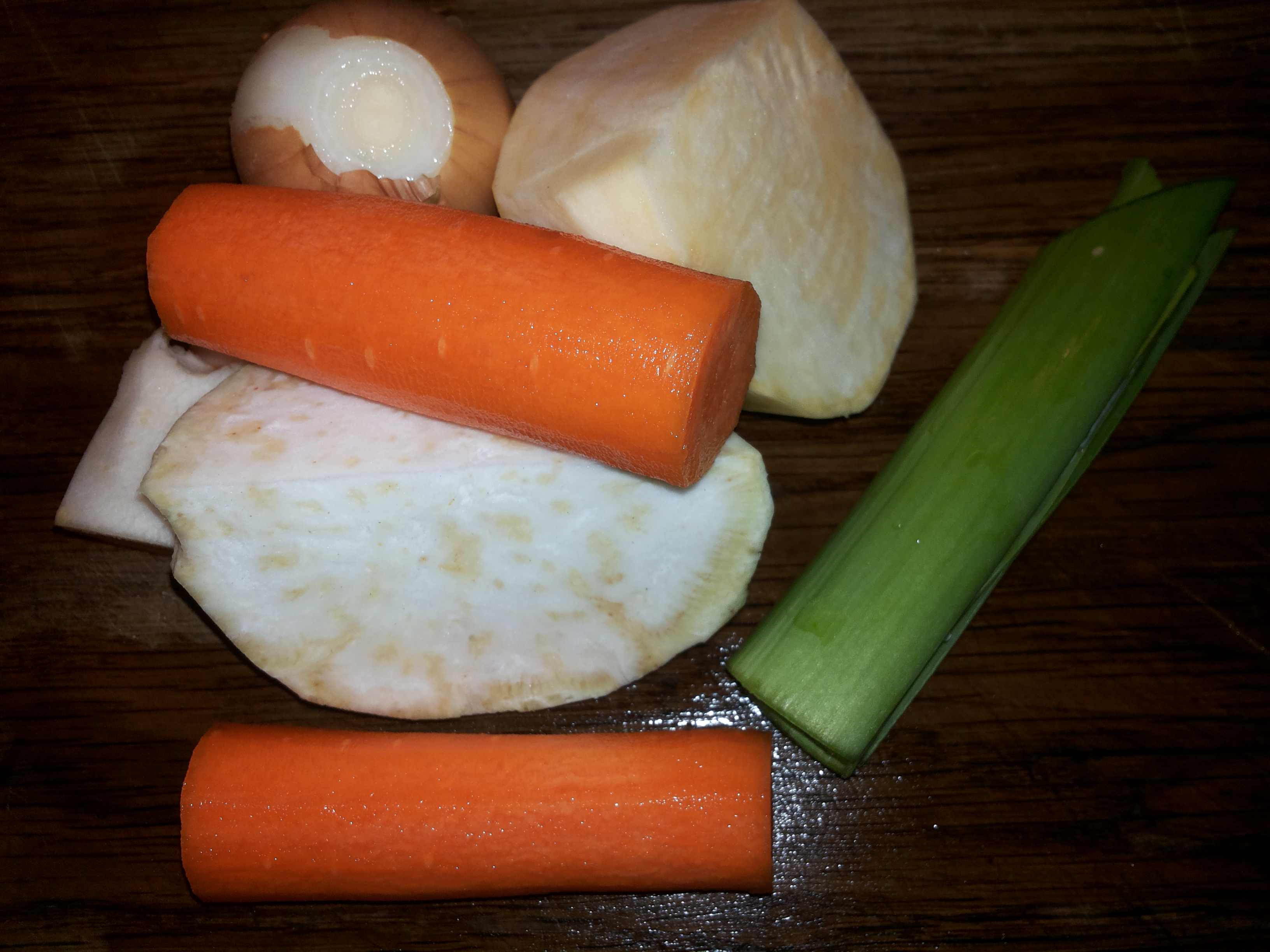 Burkāns, sīpols (tas būtu pats minimums), selerijas sakne, pētersīļa sakne, puravs