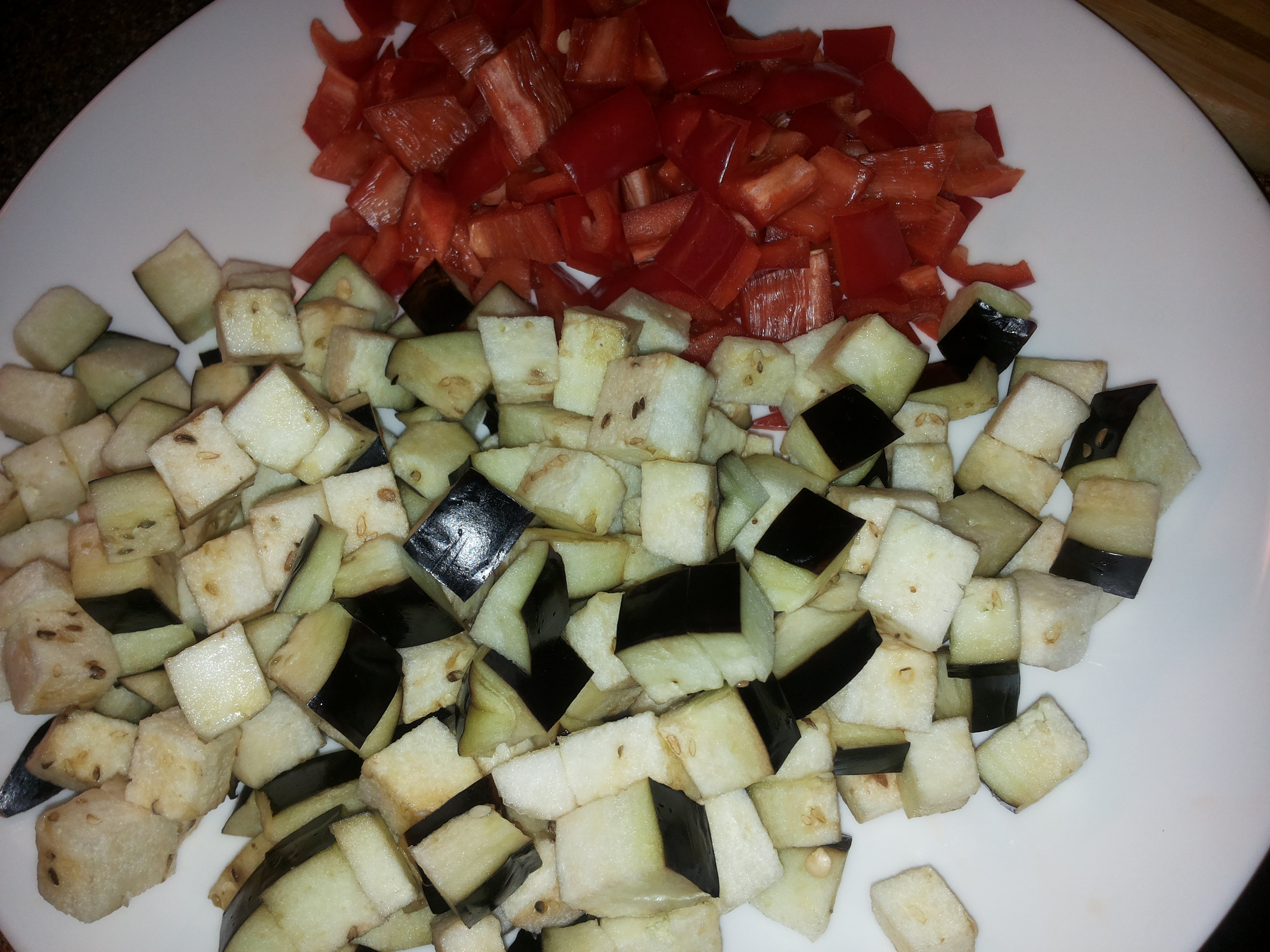 4. Uz pannas apcep sīpolus, pievieno baklažānus un papriku un turpina cept, pievieno garšvielas un zirņus un vēl mazliet pakarsē.