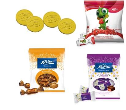 Kalev produkti, kas nesatur glutēnu – Draakon košļājamās konfektes, marmelādes konfektes, īrisi un šokolādes medaļa.